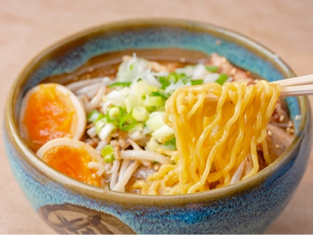 札幌ラーメン王道の「中太縮れの卵麺」が、濃厚な味噌スープによく絡み、一口ごとに旨みが広がる一杯。スープは魚介だしと豚骨、味噌のコクが絶妙に合わさり、深みのある味わい。