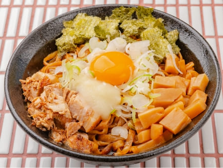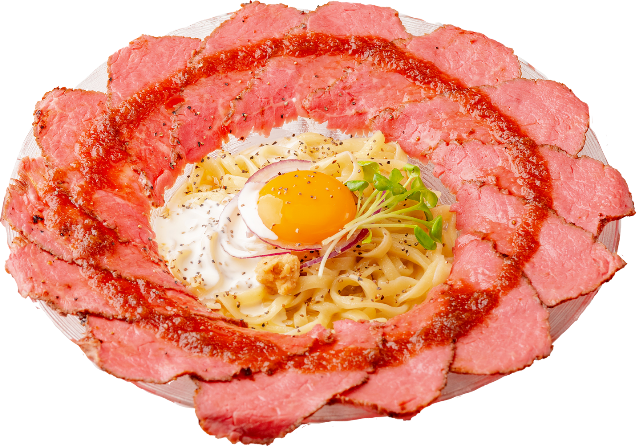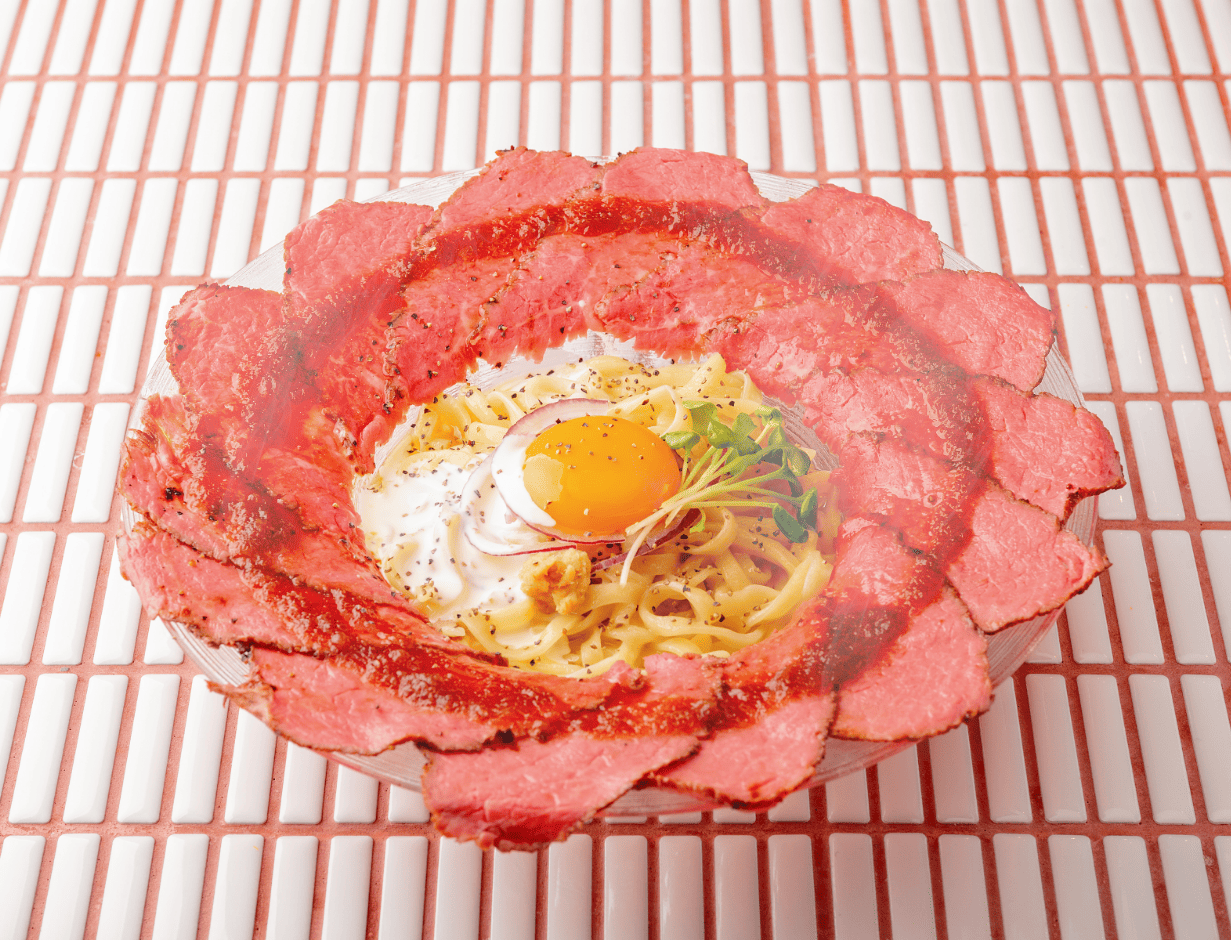 黒毛和牛のローストビーフと濃厚卵黄を贅沢に使用した、北海道産素材尽くしのまぜそば。平打ち麺はもちもちとした食感で、卵黄を絡めることで肉の旨みと調和し、至福の味わい。